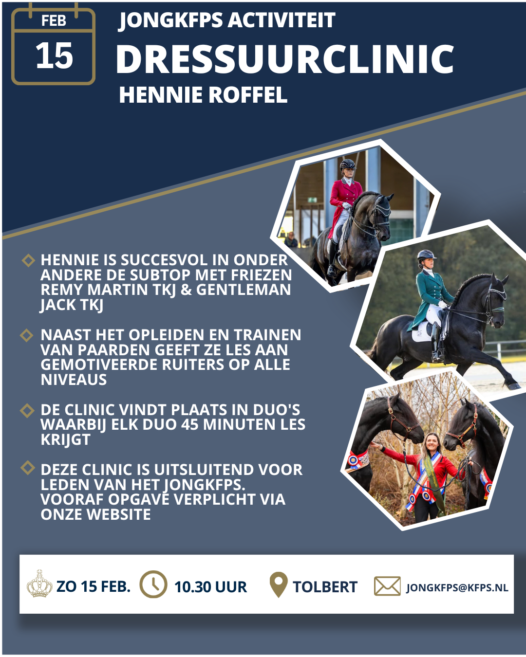 Op zondag 15 februari 20256 zullen we in samenwerking met Hennie Roffel een dressuurclinic organiseren op de locatie van HJC Manege Tolbert in Tolbert.