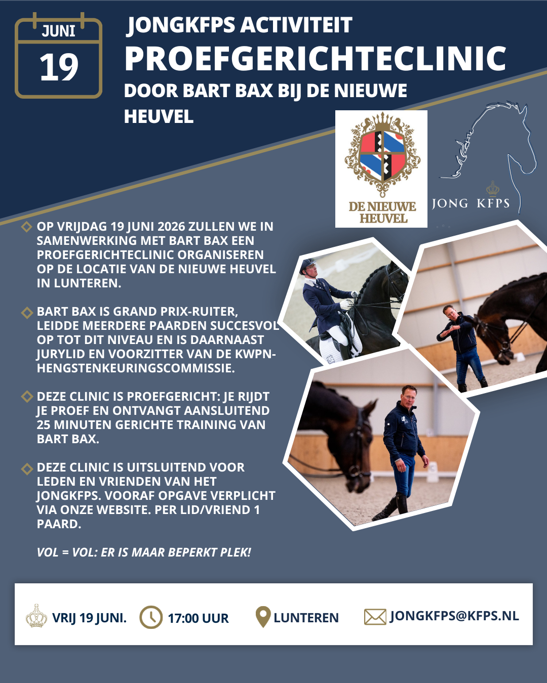 Op vrijdag 19 juni 2026 zullen we in samenwerking met Bart Bax een proefgerichteclinic organiseren op de locatie van De Nieuwe Heuvel in Lunteren.
