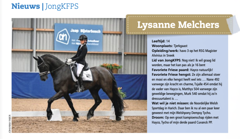 Jong als ze is, rijdt Lysanne Melchers zich in de kijker met de Friese ruin Hayco fan Sweach (Tsjalle 454). De achtjarige ruin is van haar moeder Aalwina, die Z2 startgerechtigd is met hem. Maar Lysanne heeft hem bijna van haar afgepakt, zoals ze zelf stelt. Op de Friese indoorkampioenschappen begin februari eindigde het duo op een vierde plek in de klasse L1.